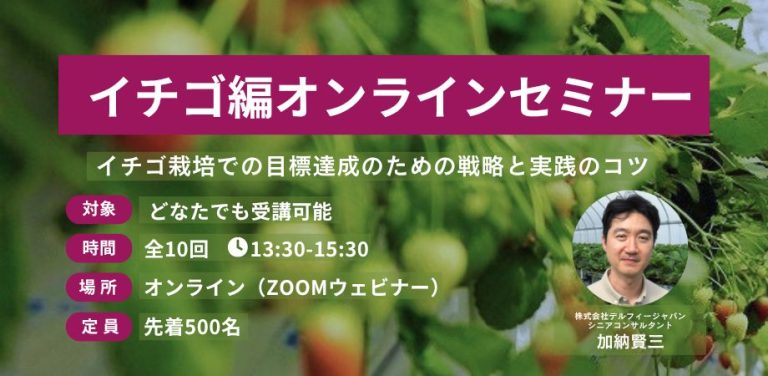 今年度も「イチゴ編オンラインセミナー」の開催が決定しました! ▶お申し込みはこちら ご好評をいただいている「デルフィージャパン イチゴ編オンラインセミナー」を、内容をアップデートして今年も開催します。 本セミナーは、作物 … 続きを読む 2026年度 イチゴ編オンラインセミナー